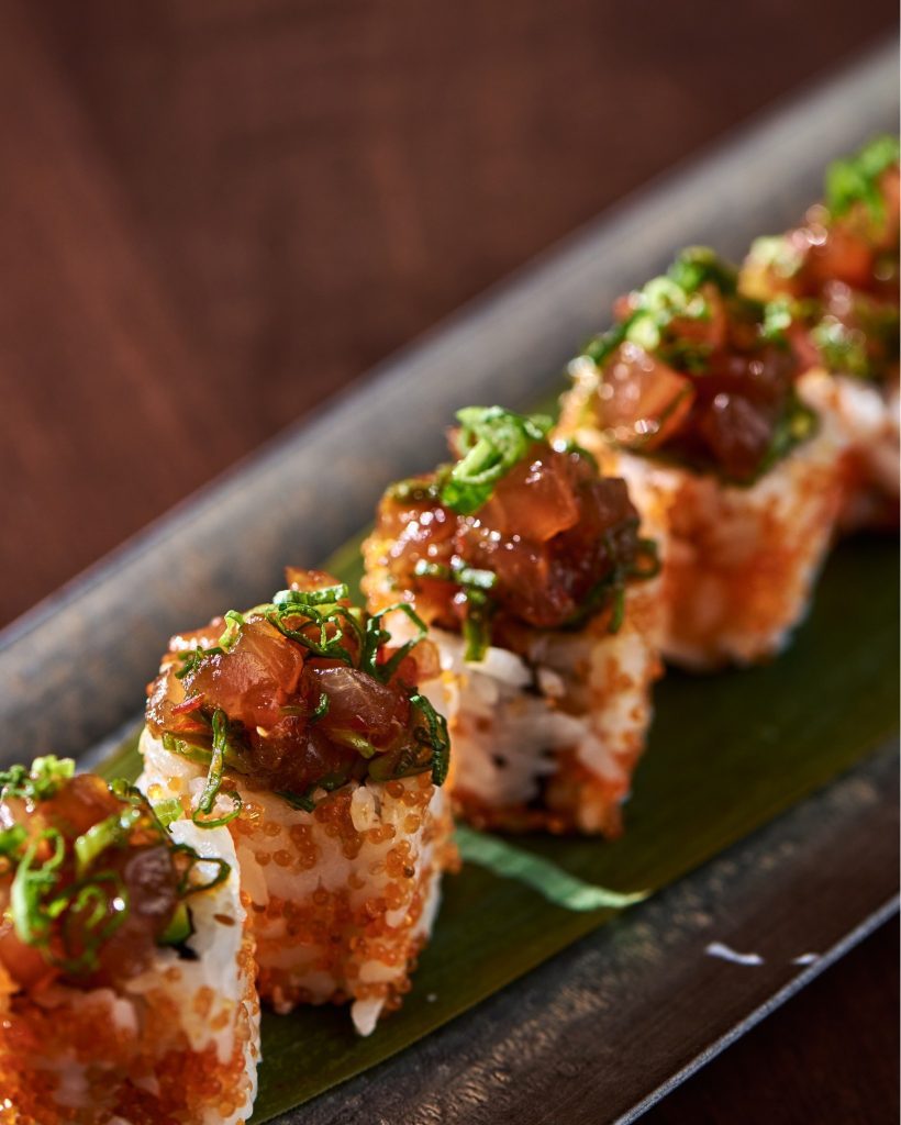 Platos emblemáticos como el tartar de toro, adornado con caviar y pan de oro, y el bacalao negro al miso, inspirado en Montenegro, ponen de relieve la creatividad del restaurante. El Tataki de ternera Wagyu, servido con una ácida salsa ponzu, es otro de los favoritos, ya que muestra la mezcla perfecta de tradición japonesa y sabor mediterráneo.